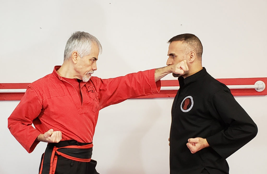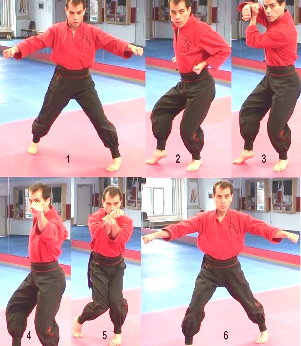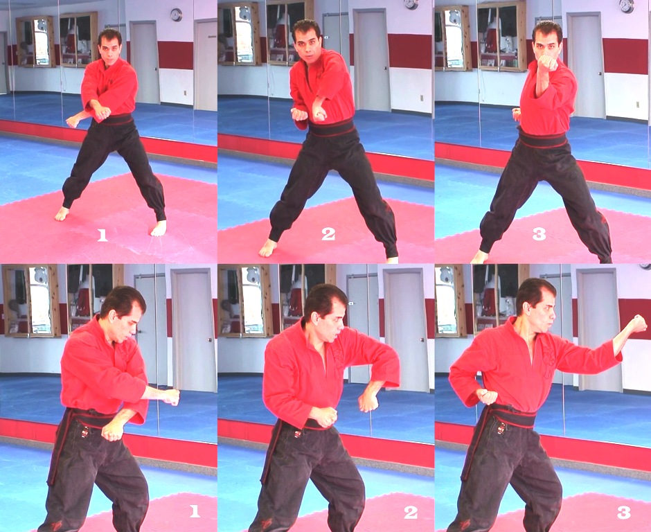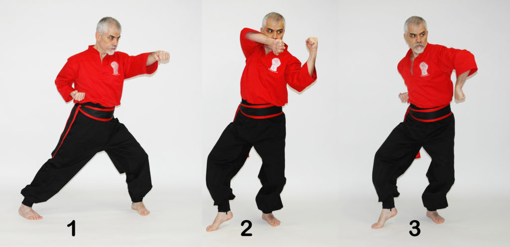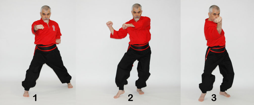 دو ضربه مشت بحالت ضربدر از روبرو. در این حرکت اگر حریف سعی در جاخالی دادن به طرفین هم باشد باز احتمال برخورد ضربه به وی میباشد. در ضمن حالت ضربدر به دستها قدرت و استقامت بیشتری میدهد