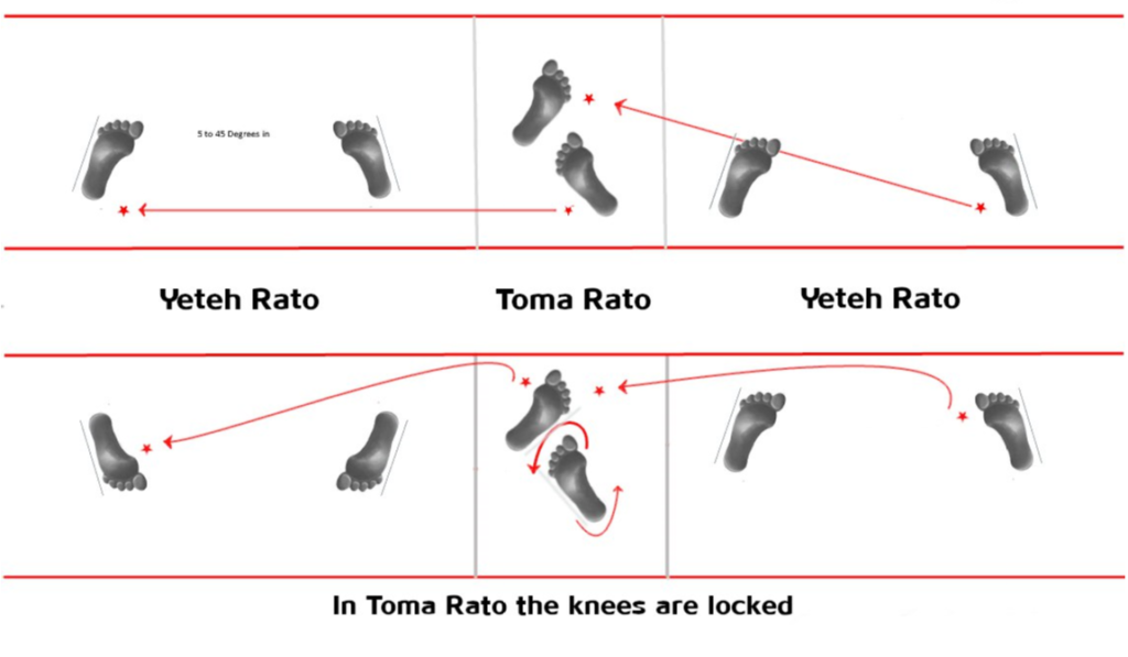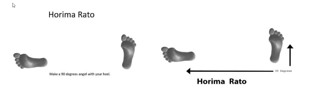 In Horeima Rato both feet are on the same line and perpendicular to each other and the heels forms a 90 degrees angle. Both knees are bent and the body weight is about 60-70% on the back leg and about 30-40% on the front leg. The distance between the feet is about 1,5 times the shoulders’ width.