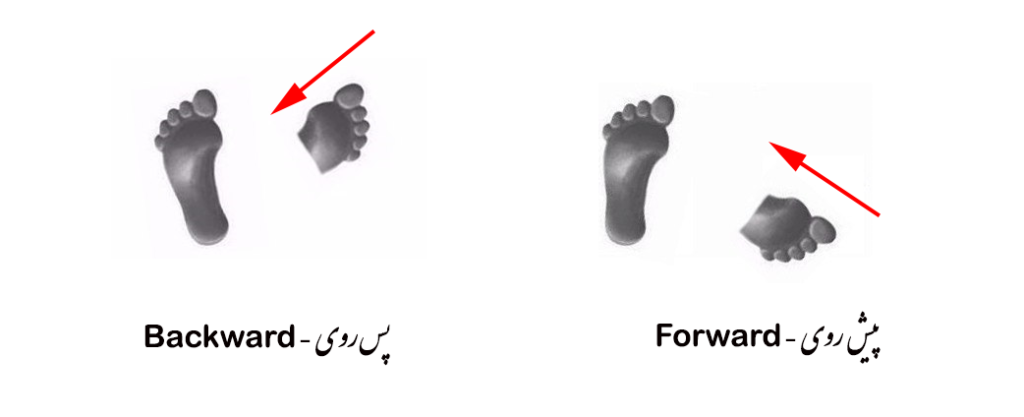 فاصله ی پاها از هم یک و نیم برابر عرض شانه میباشد، یکی از پاها کشیده و دیگری شکسته (از زانو خم) است. پای شکسته حدود ۶۰ درصد وزن بدن را تحمل میکند و دیگری که کشیده است ۴۰ درصد، هر دو پا در یک خط قرار میگیرند.