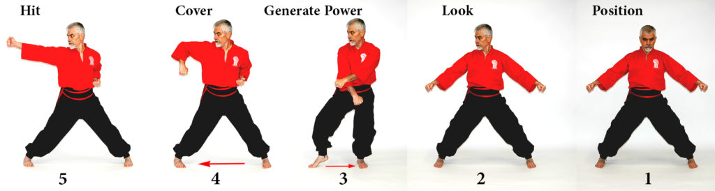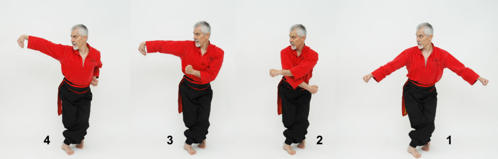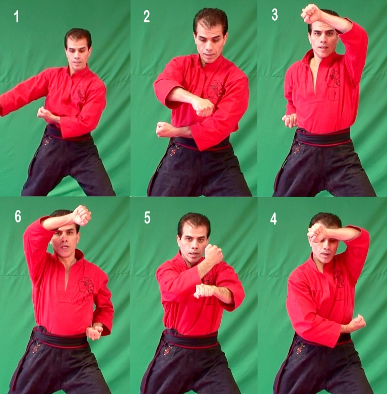From Yeteh Rato and Chino (1), first turn the head and look to the side at your opponent (2), then to generate power bring the right arm (action hand) under the left arm (reaction hand) and at the same time move the body weight on the left leg by bringing the right foot closer to the left foot (3), bend the action arm and bring the elbow up perpendicular to the ground while the reaction hand goes to the side of the body and the same time move back to Yeteh Rato (4), then hit Yeteh Mato on the shoulders line with the first two knuckles by making a 180° rotation at the end (5). Yeteh Mato, Yeteh Rato and the reaction hand reach the final position in the same moment.