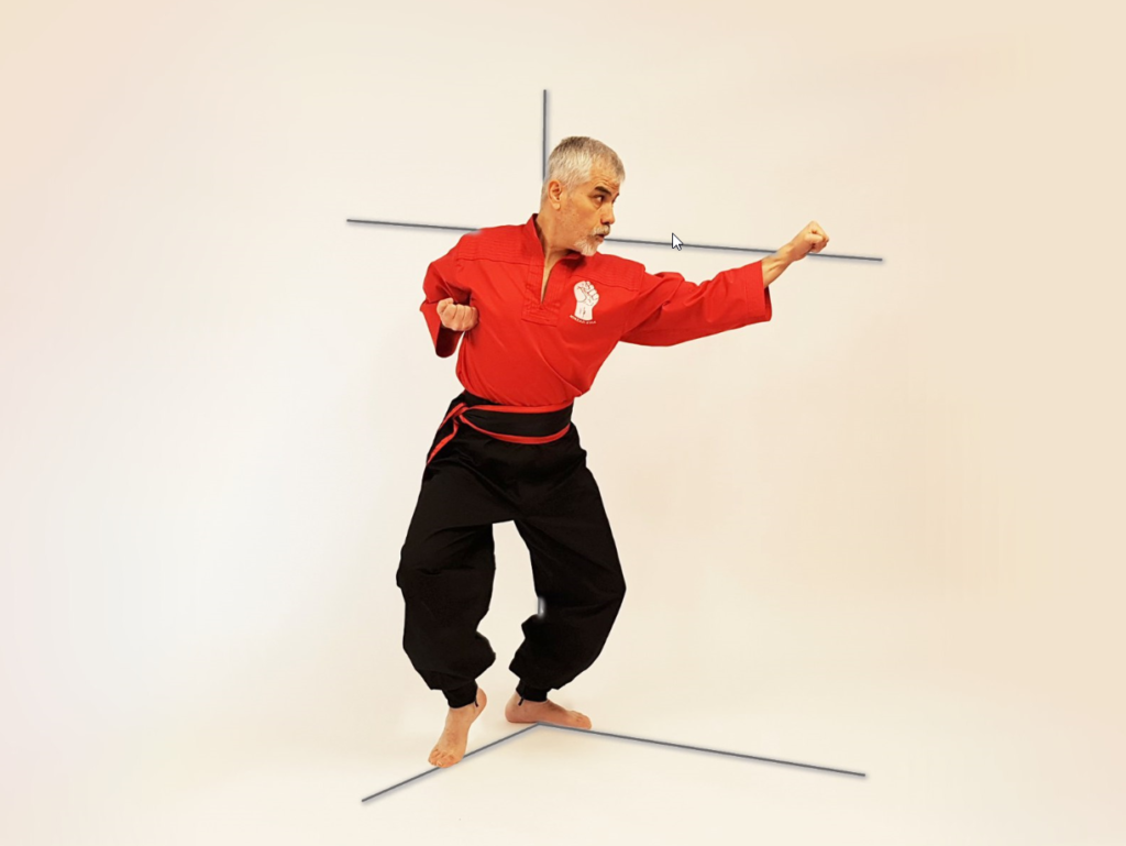 زاویه آرنج ۱۳۵ درجه، مشت دست روبروی چشم، زیر ابرو و چرخش بدن بین ۴۵ تا ۹۰ درجه در جهت تکنیک میباشد