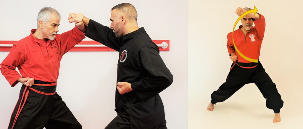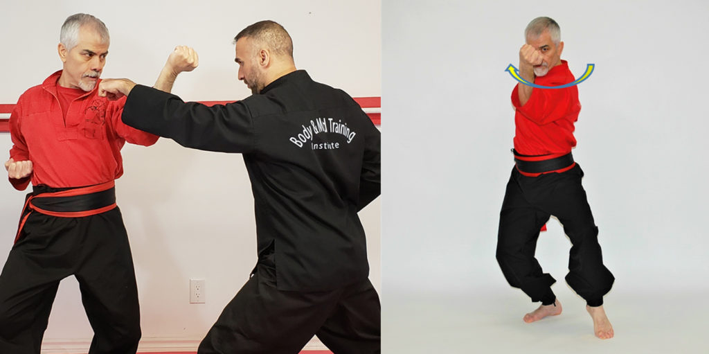موضوع مهم در ارتباط با دوران گیری این حرکت در زمان تمرین منفرد باید در نظر داشت این است که دست عمل کننده قبل از شروع حرکت (۱) بایستی یک چرخش ۱۸۰ درجه ای (۲) به مچ دست بدهید سپس از پایین به بالا (۳) تکنیک را با دوران و پیچش (۴) انجام دهید
