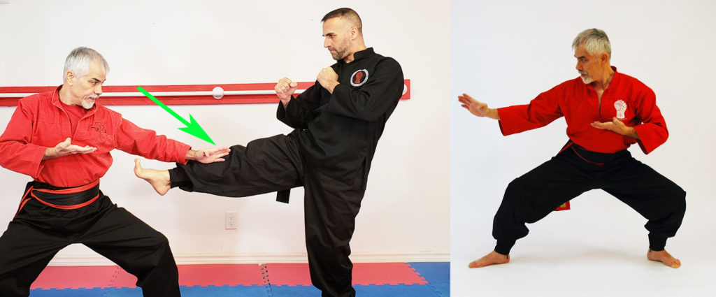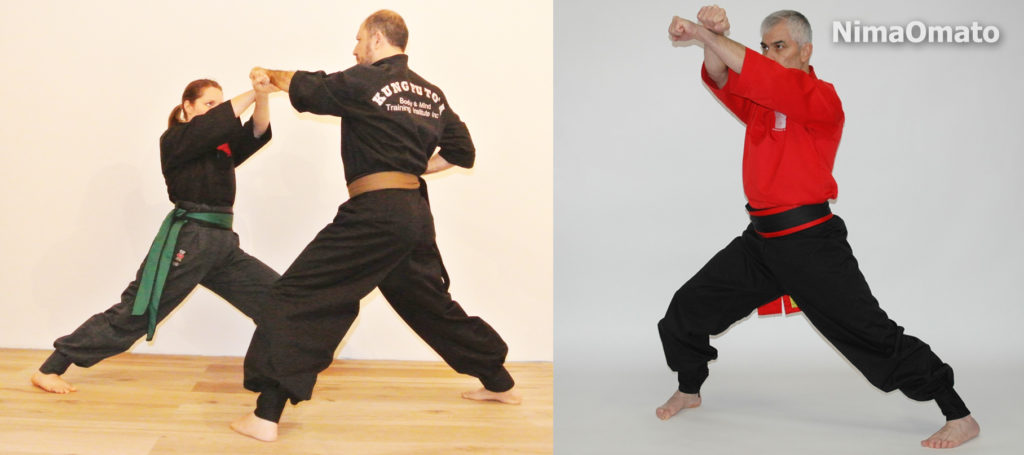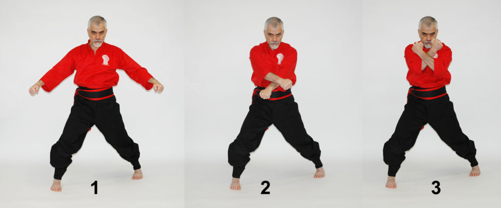 In this position the Kung Fu Ka stands with his legs on the same line. 50% of the body weight is on each leg, the feet are 5 to 45 degrees inward and they are separated from each other minimum from the toes 1,5 times the shoulders’ width and and twice from the heels.