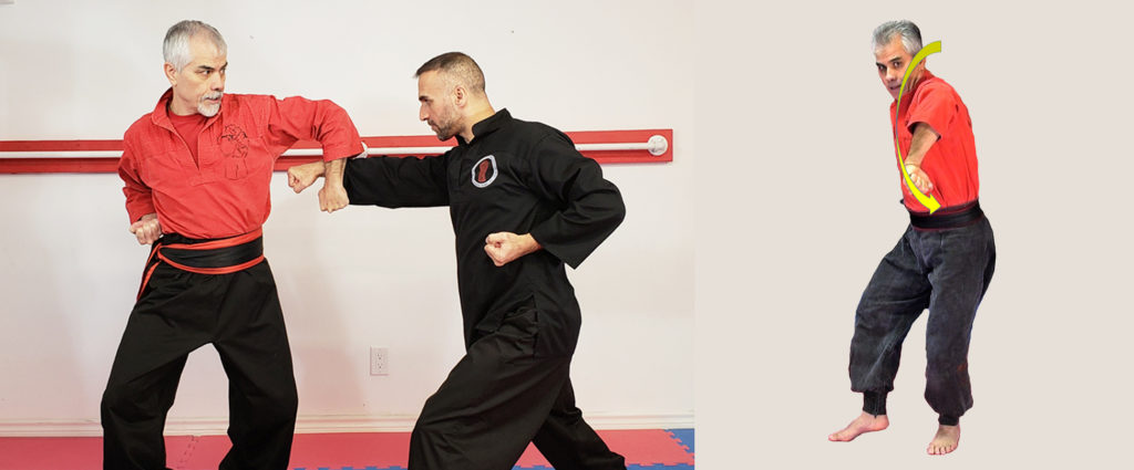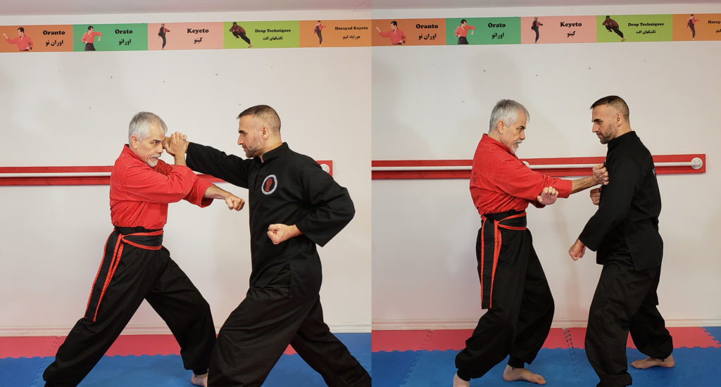 همین دفاع را وقتی از پایین به بالا ( نیما اوماتو) برای دفاع ضربه دست یا ضربه پای چکشی میتوانیم بکار ببریم. قدرت گیری هر دوی این تکنیک ها از پهلو و عکس العمل مکمل انجام میشود