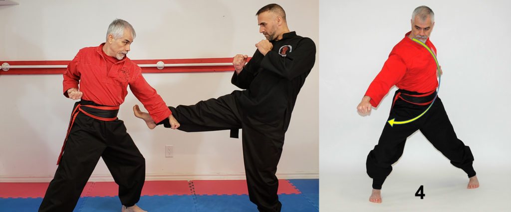 From Rato position with right arm front, move backward to YarmaRato position taking the right arm back to the side and left hand to the front of the chest (p 2) by taking the left arm to the side of the body as a reaction, same time the right arm defense the oncoming punch from right to left front of the body (p 3). The upper body turns minimum 45 degrees to maximum 90 degrees.