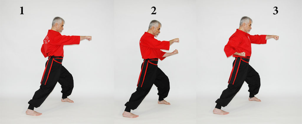 From Rato postion (1), bring the front arm (reaction hand) backward to the side of your body at the Sash level, at the same time move the opposite arm (action hand) forward (2). To give more power to the punch, both arms moves by making a “twist and turn”, a 180° rotation . During the movement, both arms must always keep the contact with the side of the body. Without moving the shoulder forward, keep the arms close to to the body as much as possible. This technique hits in front of the chest with the first two knuckles parallel to the ground (3). When hitting Mato, the wrist is slightly bent (~ 5° downward) so that the energy flows along the main bone of the forearm (radius)