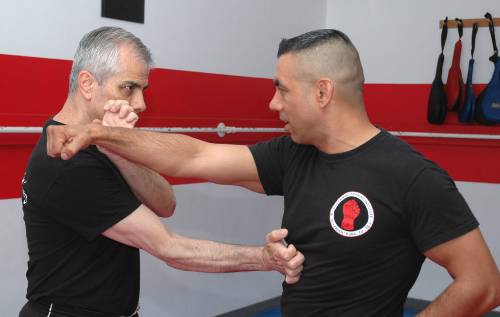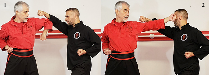 برای انجام آن از داخل به خارج ابتدا بمنظور قدرت گیری دست عمل کننده به زیر دست عکس العمل میرود (شکل ۱) و با حرکت آرنج به بالا (شکل ۲) برای پیشگیری و دوران، با قسمت داخل ساعد دفاع اوران تو را همزمان با حرکت مخالف دست دیگر بعنوان عکس العمل تکنیک را انجام میدهد.