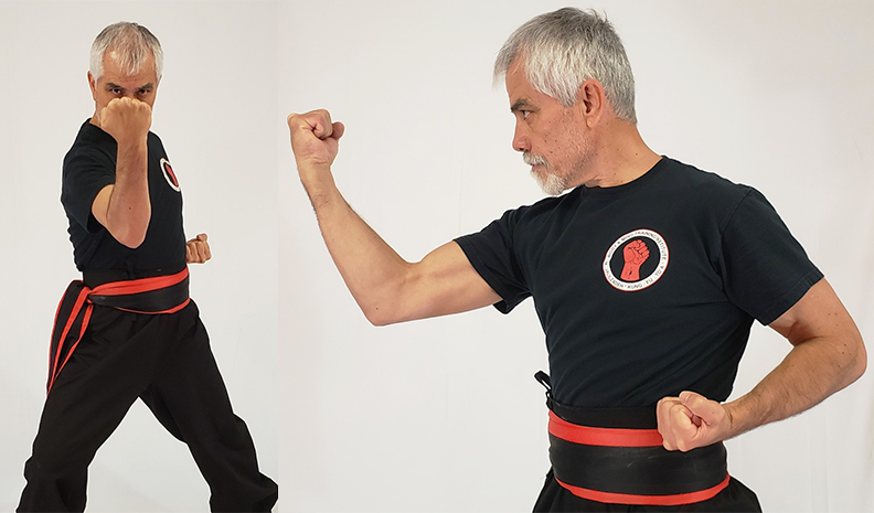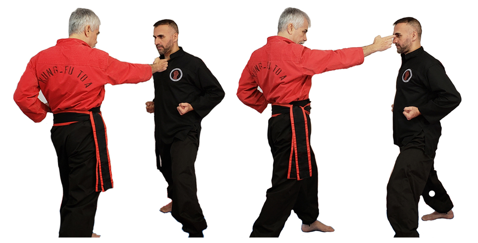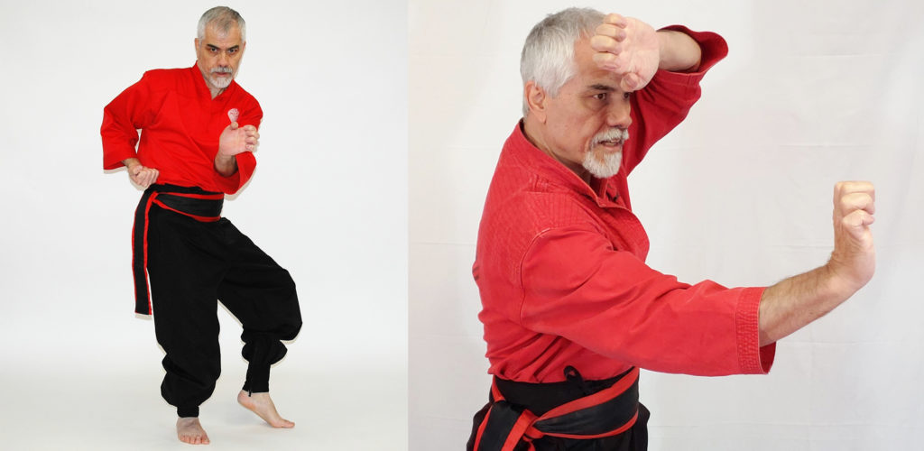 From Rato position, bring the arms close to the body at the Sash level for generating power and at the same time slide the rear leg to Yarma Rato, then move the action arm upward, so that the action hand is perpendicular to the ground and the reaction hand is external and parallel to the ground, the back of the fists are facing each other. The action hand moves forward to the 0 degrees to block from an incoming punch and the reaction hand goes down to the side. The upper body is turned so that the front shoulder is to the 0 degrees, the front arm is bent and the elbow forms a 135 degrees angle, the fist is inclined at 45 degrees. Continue the movement and protect the front of the body by turning the back leg until the knees are touching each other and the arms are locked, doing a Chino defense.